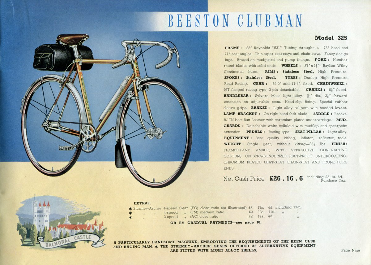 In production models, Dunlop Special lightweight steel Endrick pattern rims were usually fitted instead of the advertised alloy ones. The latest alloy fitments, Reynolds 531, pencil type stays, detachable chainwheels, and colourful "polychromatic" finishes and elaborate transfers made these very appealing machines to the aspirational "racer", clubman or casual sports rider. The price was £19. 12 s. 10 d. (single gear) with additional cost options of Sturmey-Archer FW, FM or FC hub gears and GH6 Dynohub. In single-speed form, the Clubman tipped the scales at 28¼ lbs and 29¾ lbs with a Sturmey-Archer AM hub.